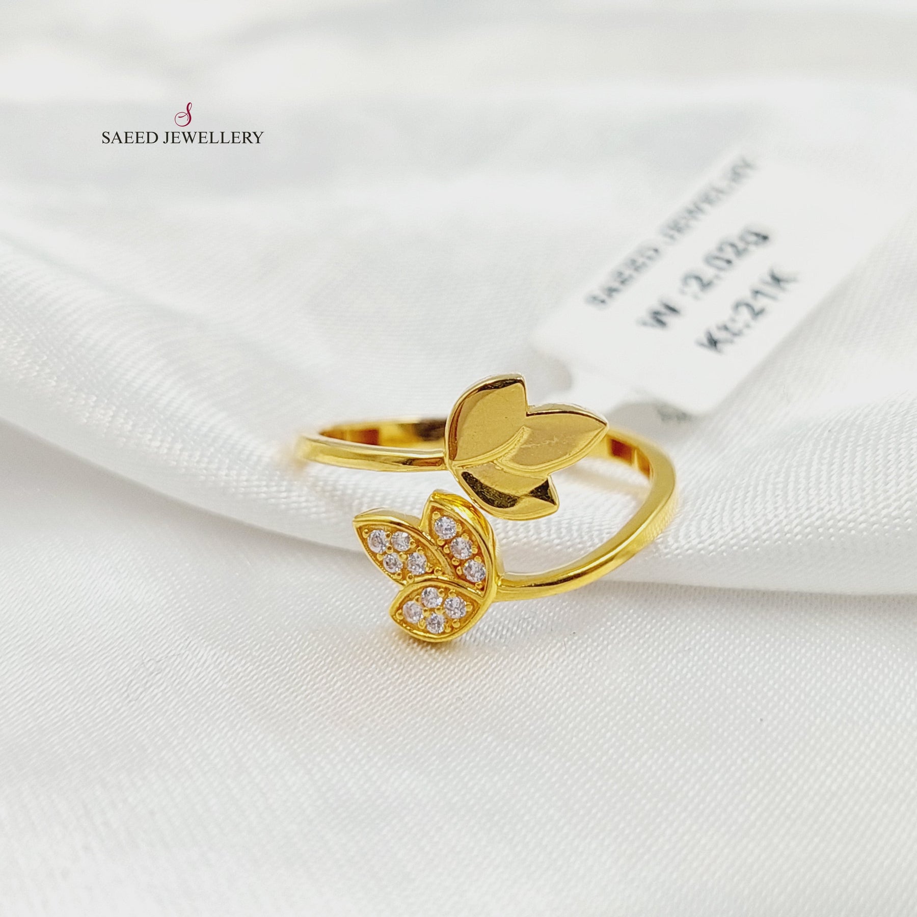 Zircon Studded Leaf Ring Made of Pure 21K Yellow Gold